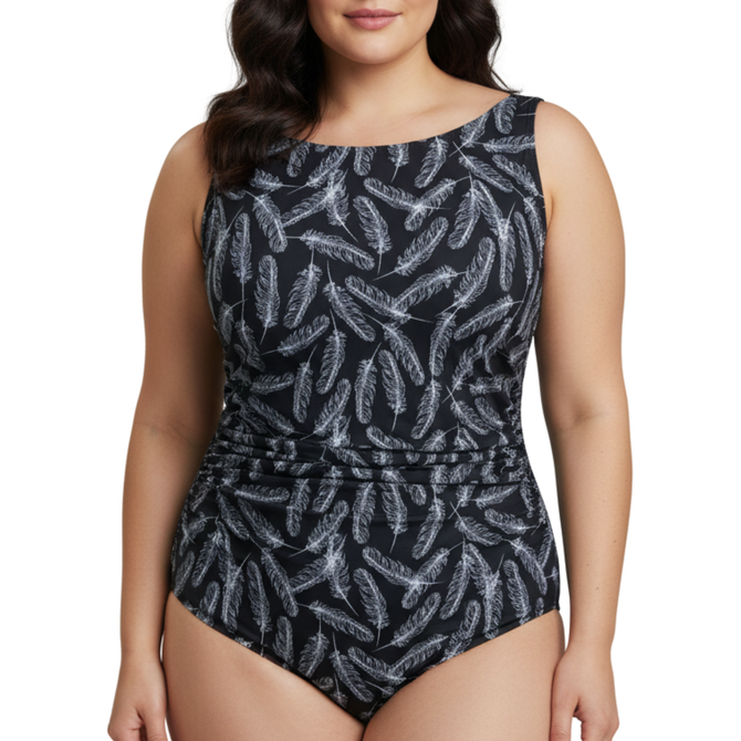 Strategic waist-defining shirring along the torso visually slims the midsection, enhancing your natural curves. A built-in shelf bra provides comfortable support, while the full-coverage bottom ensures confidence and security in and out of the water.
