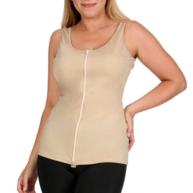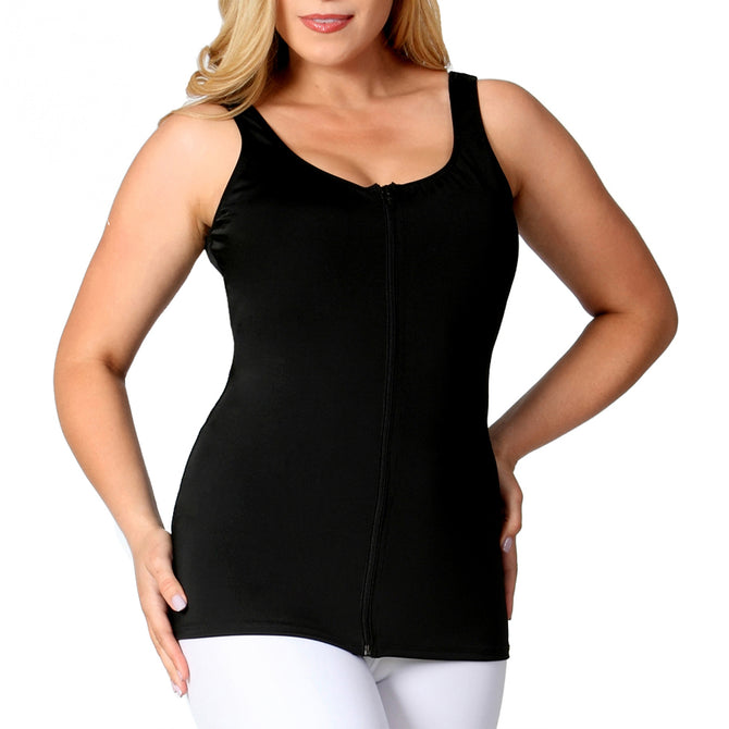 The InstantRecoveryMD Zip-Up Vest Style Tank Top is a versatile garment designed for both post-operative wear and everyday shapewear. Crafted from our special InstantRecovery fabric, this top ensures maximum comfort while keeping surgical areas secure to heal correctly. The full front hook-n-eye plus zipper closure offers a secure fit and makes it easy to put on and take off. This sleeveless top features a scoop neckline, providing slimming and shaping from the upper torso down to the hips, with comfortable wide straps for added support. Seattle, Washington